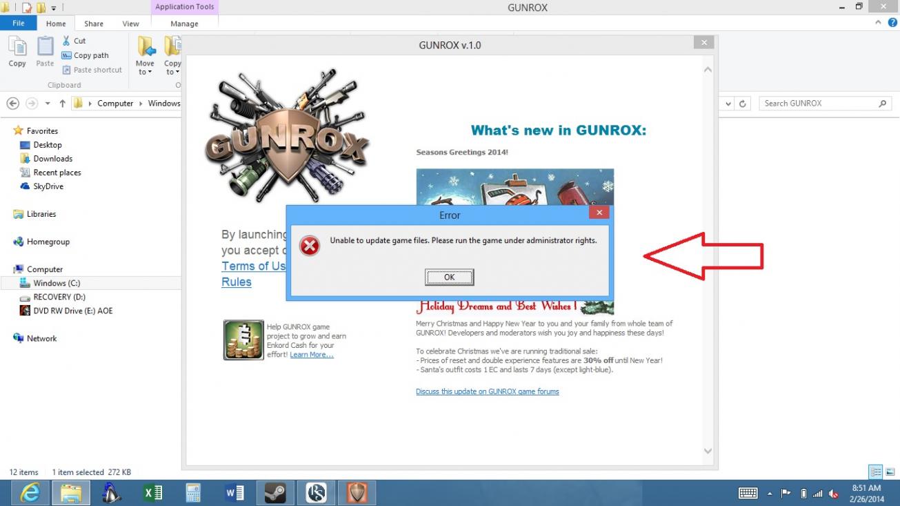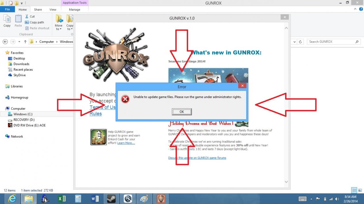 So I haven't played gunrox in a while and I was bored and sitting around my house. I decided to get on gunrox because I hadn't checked in on my friends or played in a while. So I ran the game under administrator rights as I always do. (For some reason when I play this game on Windows vista, Window 7, or windows 8 I have to run under administrator rights or reinstall the game) The game just kept shutting down immediately in the initial start up each time I tried. So I tried running it normally and it just froze in the start up and wouldn't close at all. I couldn't close it using alt + ctrl + delete or normally. I had to actually emergency shut down my computer at one point. So I completely uninstalled the game and all files related to it and went to the website and installed it again. (look at images now) I tried running the game normally and it said it couldn't update the files without administrator permission (I am the administrator on my computer). So I closed the game and ran it under administrator rights and it said the same thing over and over again. Can someone please help me figure out what is wrong. gunroxlauncherror.jpg
