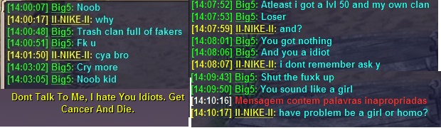 Recently this player has been insulting me directly and indirectly because of some personal problem he has with my clan, when looking at /whois we can see that hate speech is part of his day to day in his secondary accounts, and not it's no use, if you block him, he comes to another account and starts over, I need support from the admins
