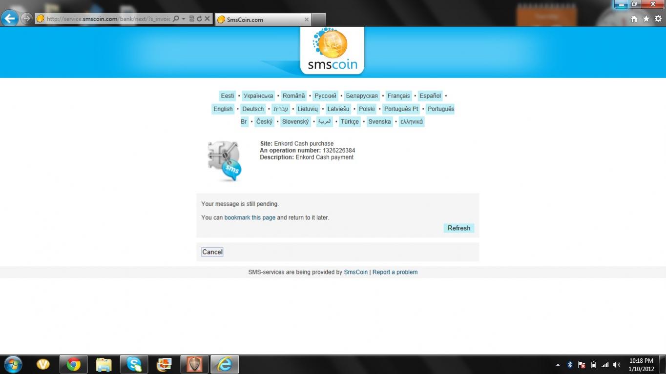 i tryed to make 1$ >>500E from sms coin and i continue everything but on this pending etc. it stay more than 2 hours !