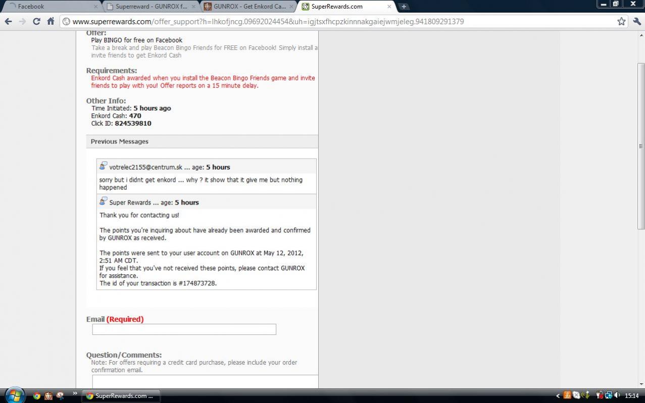 hello i did a little survey from superreward and it says that it ggive me enkord but it didnt ID of transaction is #174873728.
