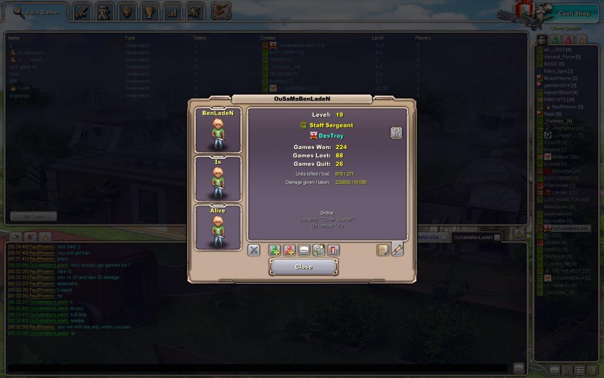 He goes to clover and goes on a normal game again and you can see in my prints, he wins vs a lvl 25 and took 20 damage, 0 units lost.