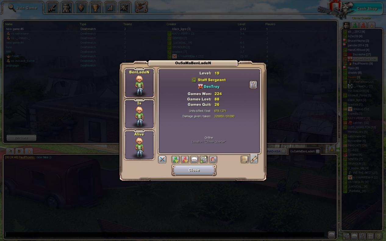 He goes to clover and goes on a normal game again and you can see in my prints, he wins vs a lvl 25 and took 20 damage, 0 units lost.
