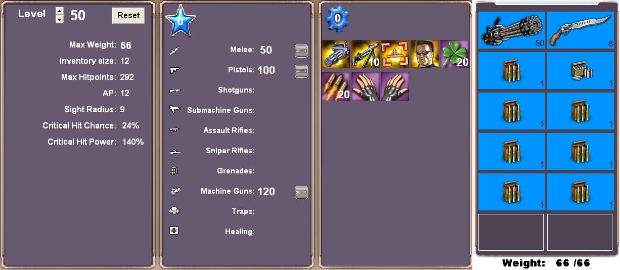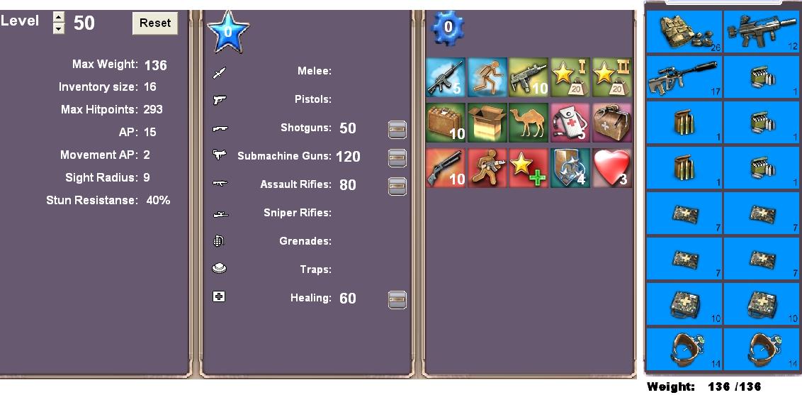 I just have no idea what meds will be better to use, but maybe you talk for any build like this? 1. You forgot how weak military is at high levels? better take imp power, aug silencer isnt on shop, and u need a medium range gun. aug does like 0 damage on medium range, so its just for long range. btw, 120 skill at meds is little too much... 120 skill arent very good though, 44 hp only.