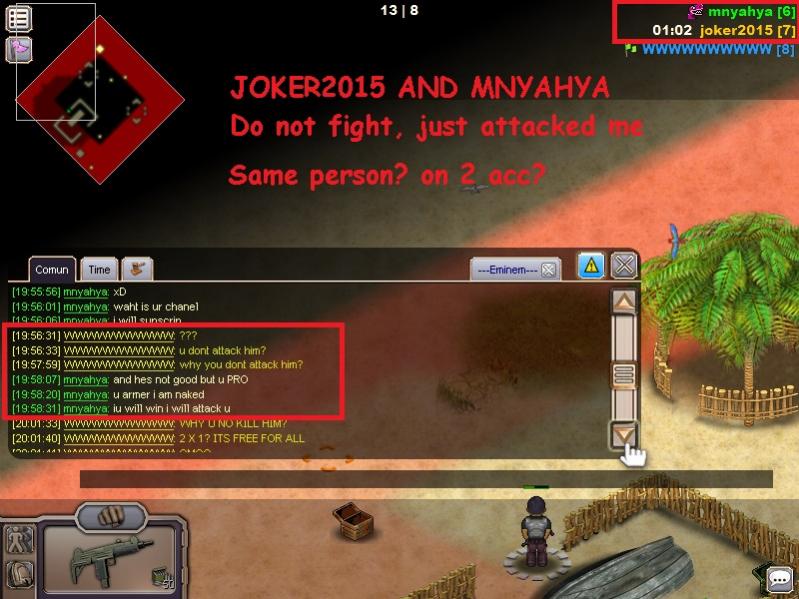 2 boys called me to play, I went and played with them during the game the player (JOKER2015) was naked, and did not attack me, just stood vizualisando me to your friend (mnyahya) attack me, and also said the game disguise he was naked so be attacked, they did double during the game to kill me, I want at least to do justice, the game is not as valuing with attitudes like this, many players quit and play .