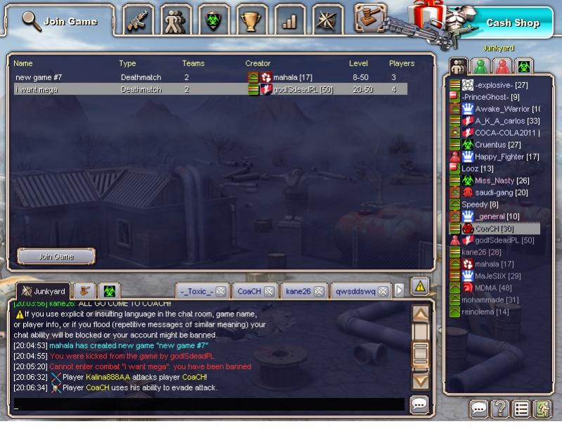 GODISDEADPL: A typical scardy-cat player who wants to stack teams in his favor in megas. He knows I am a pro and he is SCARED. Even though he is lvl 50 and I am lvl 27, he still kicks me from his mega because he knows that I can beat him. The screenshot below shows him kicking me from his mega when it is nowehere near full and barring me even though his mega allows levels 20-50. I challange you coward, lets play a mega!